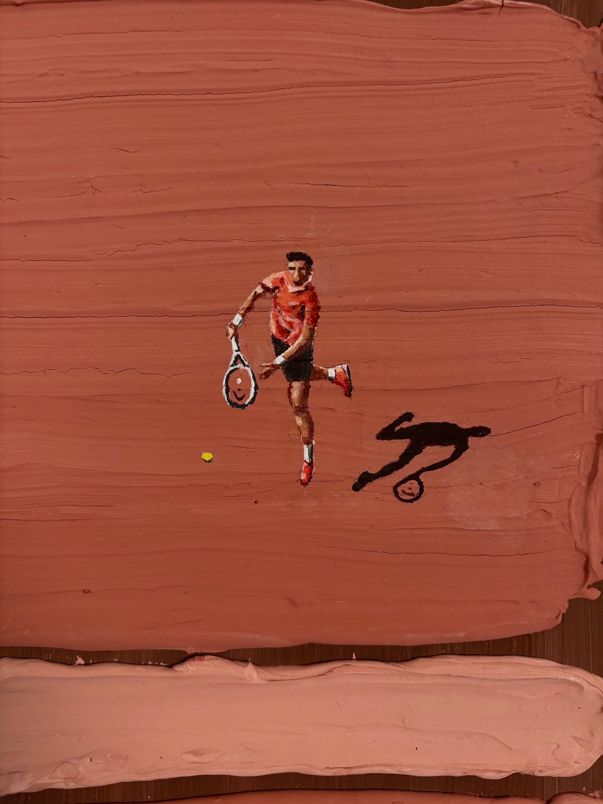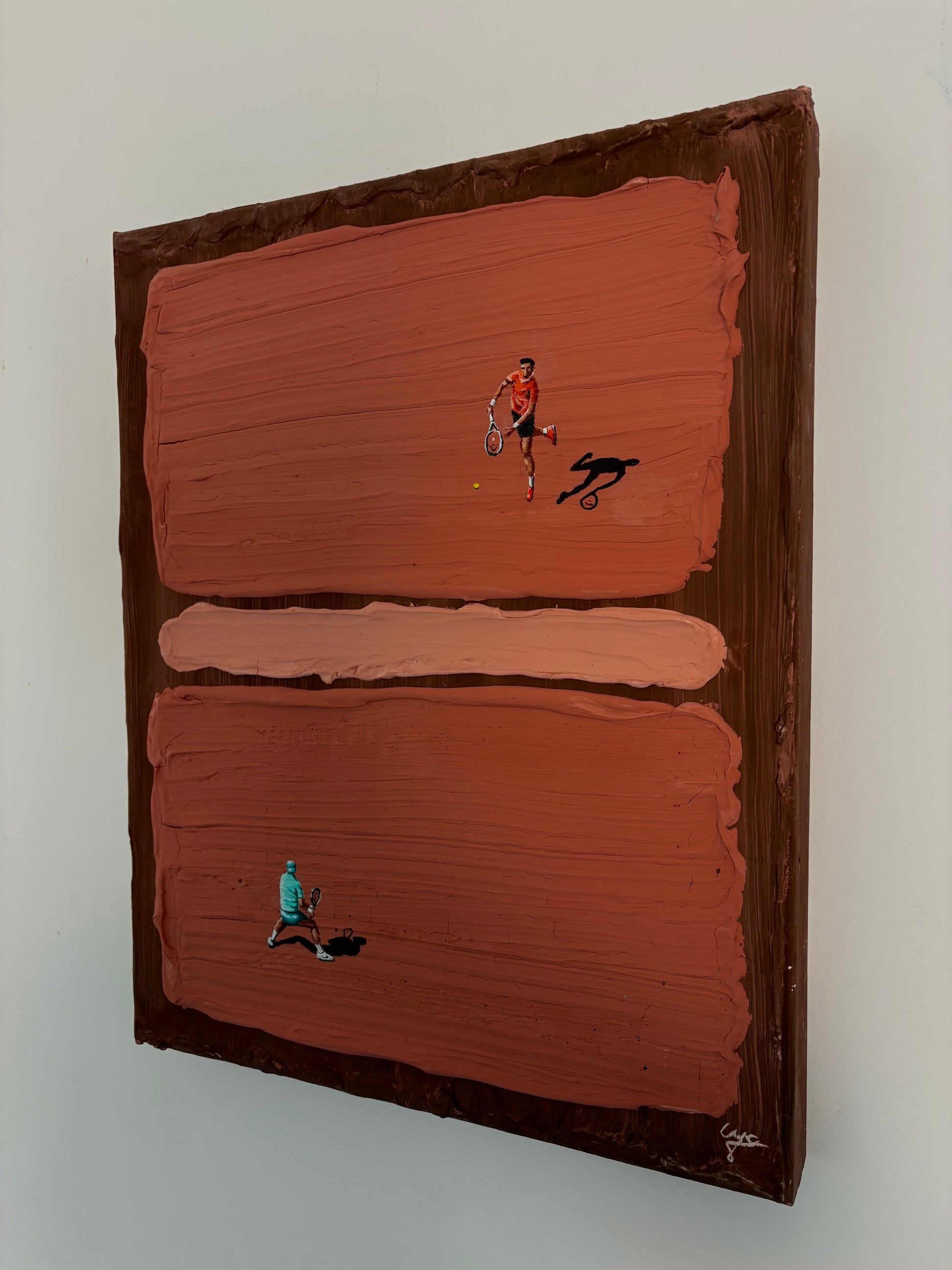 - Handmade abstract tennis painting featuring two tennis players on a clay court